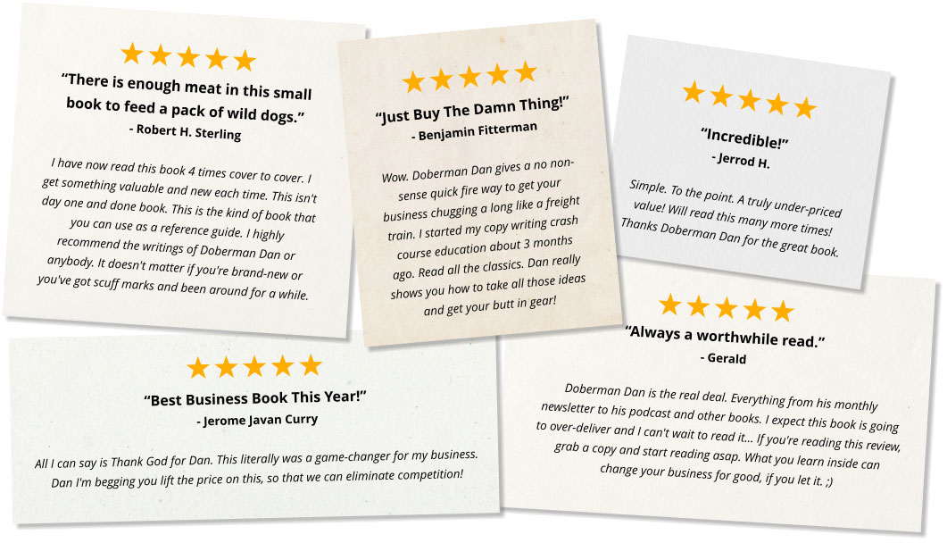 Loaded with in-the-trenches wisdom the average marketer would ordinarily never get access to. And, in true Doberman Dan fashion, lays out a potent blueprint for generating sales... so absurdly simple... it could easily be titled, ‘The Idiot's Guide To Getting Rich With Direct Response."